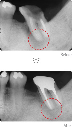 神経の管を通じて、歯根から根の先の骨の中にまで細菌が入り込んで炎症を引き起こし、骨が溶けてきています。根の周囲の白い部分が骨にあたりますが、根の周囲の骨が溶け、黒く写ってきています。根管治療後は炎症が無くなり、骨が再生して、黒い部分が無くなってきています。