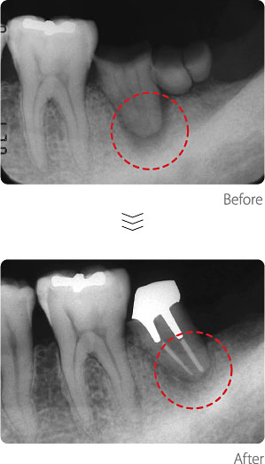 Case1と同様に、歯根の周囲の骨が、根の中からの細菌に侵され、溶けてきています。根管治療後、細菌がいなくなり、骨が再生しています。右端の一番奥の小さな歯(親知らず)は、むし歯が極めて進行し、歯根がほとんど溶けてなくなってしまう手遅れの状態となっていたために、残念ながら抜歯となりました。