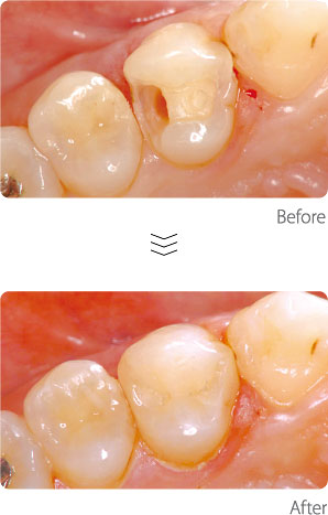 メタルインレー(金属の詰め物)の下にむし歯ができてしまい、金属を除去後、むし歯を取ったところです。その後コンポジットレジン(歯の色をした樹脂)で歯を修復しました。治療後は、歯質と一体化し、詰めた場所も分からなくなっています。