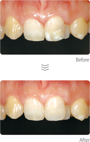 前歯にむし歯が出来て、変色していました。むし歯だけを取って、コンポジットレジン(歯の色をした樹脂)で修復しました。
