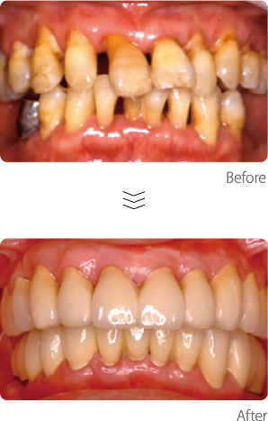 歯周病により、骨が溶けて歯ぐきが下がり、歯がグラグラになっていました。原因である細菌を除去して歯ぐきの炎症を改善し、被せ物によりグラグラの歯を補強、見た目の回復を図りました。抜けてしまっていた奥歯には、インプラント治療も行っています。