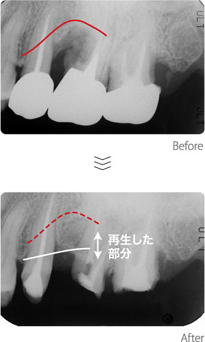 歯ぐきの内部の根の表面で細菌が繁殖し、周囲の骨が失われつつありました。原因である細菌を除去し、骨を再生する処置を施しました。骨が無くなってしまい黒く写っている部分に、新しい骨が再生している事がわかります。